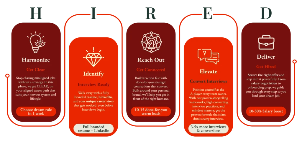 For action taking job-seekers who are done wasting 6–12 months in the job hunt, feeling stuck, and tired of watching recruiters ignore them. This is for you if you’re ready to land the role you deserve, finally get paid your worth, and step into a career that feels aligned.